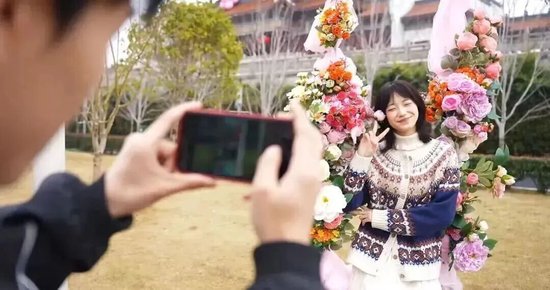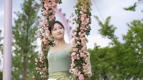 坐在巨型秋千上,身后是超大的爱心花朵,整个人像陷进了春日限定的花海怀抱,秋千荡起的瞬间满架繁花跟着风一起晃动,不用刻意找角度,每一帧都是自带柔光滤镜的春日画报。