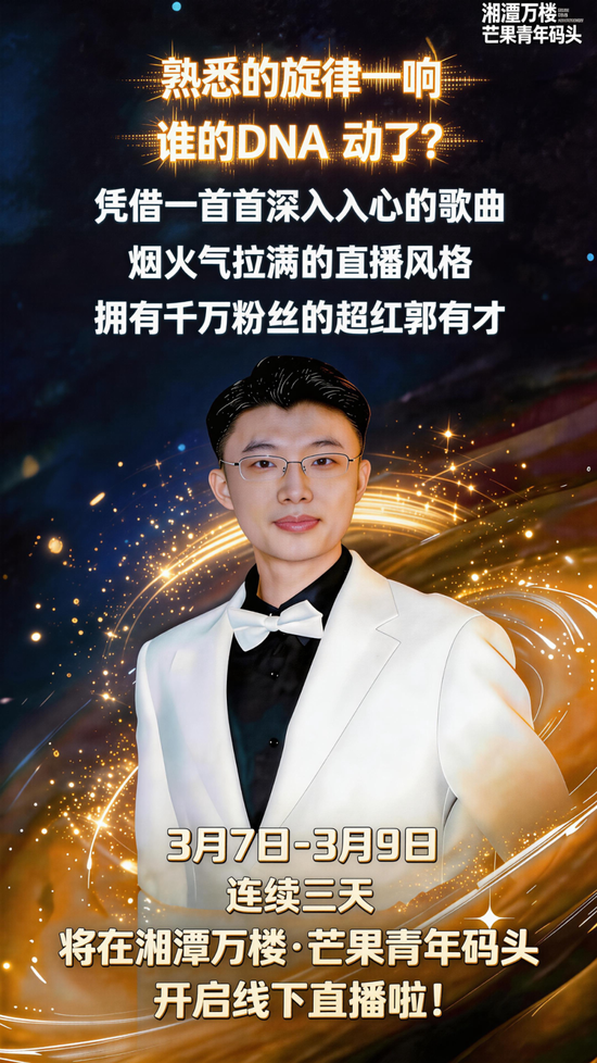 而这一次我们不用再隔着屏幕,刷着片段反复循环。3月7日-3月9日郭有才将在湘潭万楼芒果青年码头,把他最动人的歌声唱给湘潭的每一个你听。