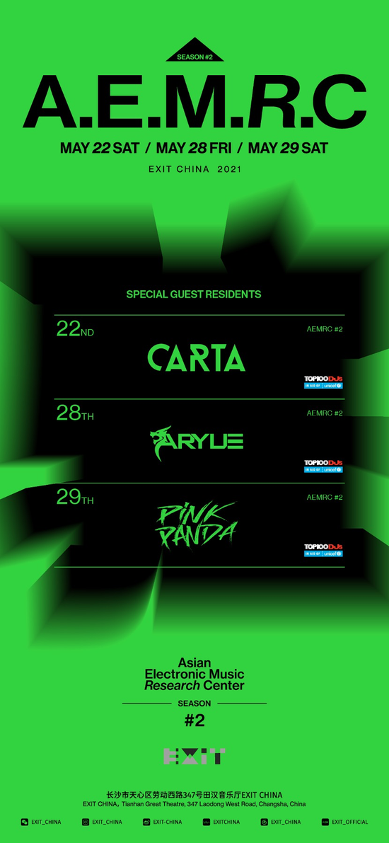 5月22/29/30日,EXIT邀请国内仅有三名TOP 100 DJs:Aryue、Carta、Pinkpanda作为Special Guest Resident的全新身份常驻EXIT,可以说是将国内优秀的电子音乐艺人全部揽收其中,并在5月开始他们在EXIT 的首次演出。