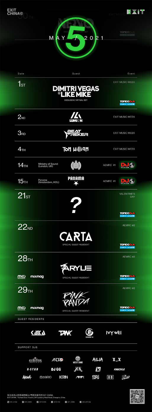 5月14-15日,EXIT与两家世界百大俱乐部达成深度合作,即Minnistry of Sound Club(#26)及Panama Club(#82),将世界百大俱乐部的现场搬到EXIT,实现亚洲和国际之间的电音文化互通。