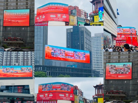 来自各行各业劳动者的身影和笑脸,在长沙芙蓉广场、五一广场锦绣中环、长沙IFS国金中心、河西银盆岭万达广场等商圈、地标建筑的户外巨屏上被点亮。一线工人、科技人员、人民教师、外卖骑手……在不同岗位辛勤工作的他们,展现着各不相同的劳动者模样,却彰显着同样值得歌颂的劳动精神。