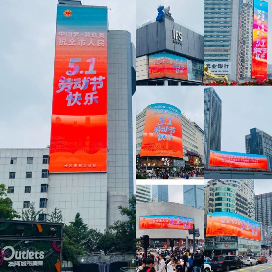 为向劳动者致敬,5月1日早上8:00起,长沙各大商圈、各大地标等户外大屏,联动播放“中国梦·劳动美,祝全市人民五一劳动节快乐”宣传标语,向全市广大劳动者致以节日的温馨祝福。