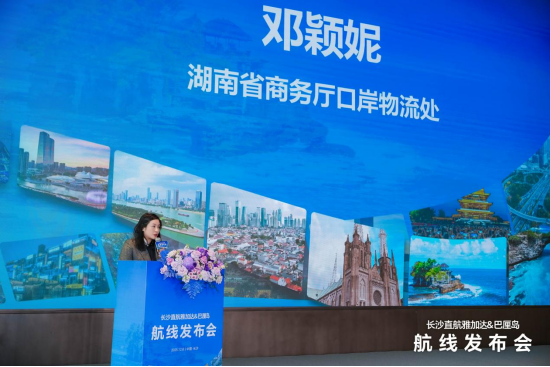 湖南省商务厅口岸物流处代表邓颖妮莅临致辞,对航线的开通给予高度肯定。她指出,本次开通的雅加达航线,是长沙航空口岸开通的首条全入境客运航线。不仅将进一步完善长沙航空枢纽网络布局,更能促进湘印尼三地在文旅、经贸、商务等领域的深度融合,为区域开放发展注入新动能。