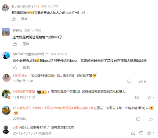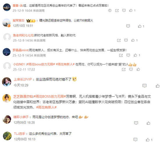 新BOSS各显神通,网友热情充分点燃。截至目前,雨花区已拥有239个国家级、省级和市级科创平台,由中国电建中南院、中国能建湖南院、普斯赛特、中南智能等龙头企业引领,构建起扎实的技术研发与产业协同基础。今年技术合同成交额有望突破500亿元,稳居全省第一,全区集聚科技人才超10万人,创新活力持续迸发。《雨花有新人》新BOSS篇打破对企业创始人的传统印象,自信展示新时代、新赛道的成功可能,将抽象的创新创业概念转化为具体的个人故事,以崭新赛道为亮点,成功激发网友讨论热情。公众不仅关注到前所未见的新BOSS与行业,也透过他们的故事中,拼凑出雨花开放、包容的创业生态,从而对雨花创新创业环境有了更直观、深入的了解。