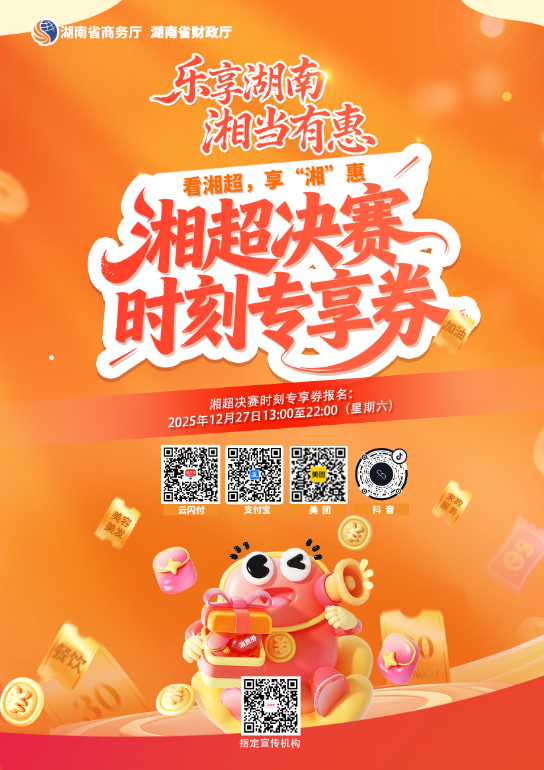 关注为持续激发市场活力,便利广大消费者享消费实惠,湖南省商务厅联合湖南省财政厅近日对“2025‘乐享湖南·湘当有惠’”消费券活动进行专项消费服务升级,特别增设线下“湘超决赛时刻专享券”现场领取通道,将促消费活动与体育赛事深度融合,进一步提升市民参与体验与获得感。