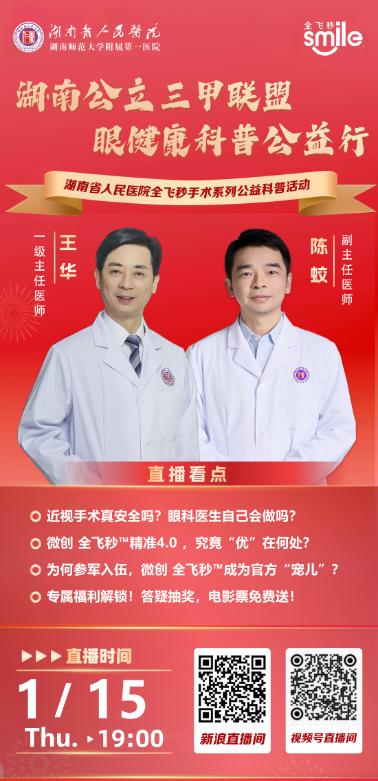 值此湖南省人民医院开展近视手术30周年之际,1月15日晚19:00,湖南省人民医院眼科主任王华、眼视光中心主任陈蛟将共同亮相直播间,为大家带来权威、实用的近视矫正科普,并现场讲解一台微创 全飞秒™精准4.0手术。