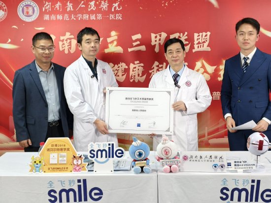 直播特别环节中,蔡司公司现场授予湖南省人民医院眼视光中心“微创全飞秒手术质量贡献奖”,这一奖项不仅是对医院在微创 全飞秒™领域临床成果与高质量服务标准的权威认可,更是对其作为区域技术引领者,长期致力于推动屈光手术安全性与精准性提升的充分肯定。