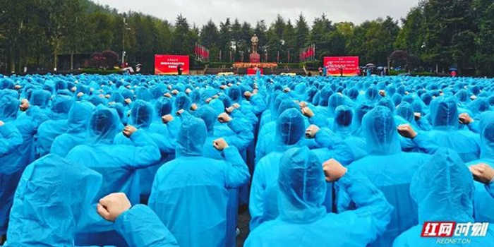 “请党放心,强国有我!”3月16日15时20分,韶山毛泽东广场细雨如织,来自郴州综合职业中专学校与郴州市永兴县第一中学的学子,身着统一的蓝色雨衣,宛如一片涌动的蓝色海洋。