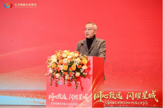 省旅行社协会会长左毅在讲话中高度评价长沙市协会的工作成效。他指出,长沙以入境游客接待量中部第一的成绩,为全省树立了标杆。长沙市协会在燕妮会长带领下,党建有力、创新有为、服务有温度,成为全省行业的“领头雁”。左毅表示,2026年省协会将聚焦入境游全域突破、人才队伍共建、行业生态优化三大重点,与长沙携手并进,推动“全省一盘棋”协同发展,助力湖南建设世界知名旅游目的地。