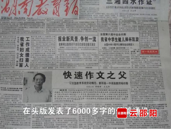 1995年9月9日,《湖南教育报》头版刊发6000多字的长篇通讯,第一次称他为“中国快速作文之父”。