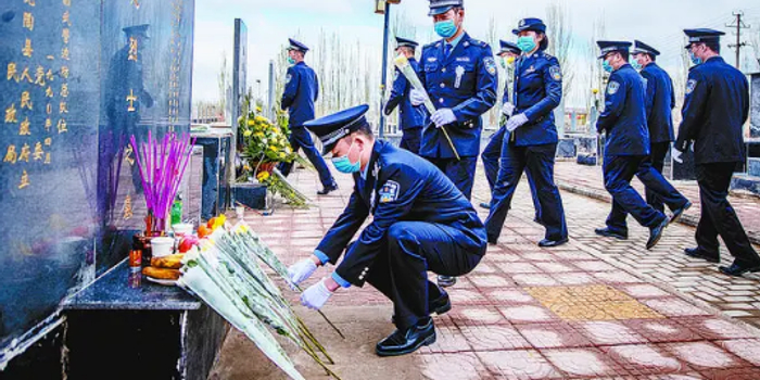 4月3日,新疆维吾尔自治区克孜勒苏柯尔克孜自治州边境管理支队民警在疏勒县烈士陵园向牺牲在反恐维稳战场上的烈士敬献鲜花。孙树伟 摄