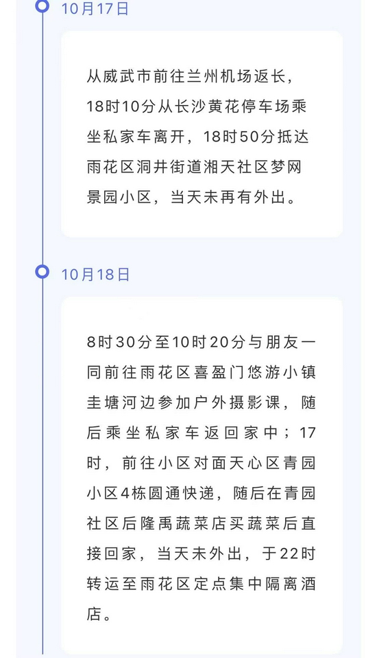 经初步核查,彭某某,女,58岁,10月10日-17日曾在宁夏银川、内蒙古额济纳旗、甘肃张掖等多地旅游。17日15时40分自兰州乘坐EU2446航班于17时45分抵长,与10月18日长沙县报告确诊病例蒋某某同航班(非同排及前后三排)。目前,彭某某已闭环转送至长沙市公共卫生救治中心隔离救治。