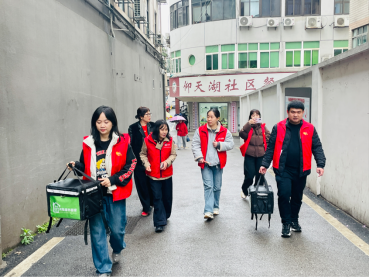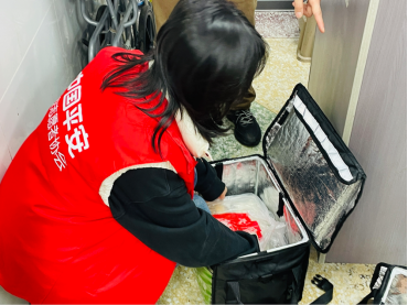 与此同时,另一组志愿者则前往社区“老年爱心食堂”,协助开展午餐分装与配送工作。即将午饭时间,志愿者们迅速分工协作,将刚出锅的饭菜一份份细心打包、装盒。随后,他们化身“送餐员”,拎着沉甸甸的保温箱,冒雨穿梭在小区楼栋之间,将热气腾腾的午餐及时送到高龄、失能老人的家中,确保他们足不出户也能吃上“暖心饭”。