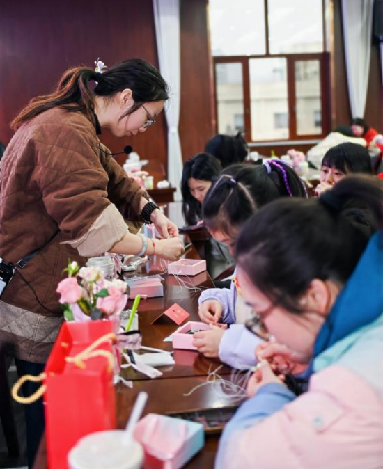 宋锦的华光与串珠的璀璨交相辉映。在手工艺人的指导下,女职工们或飞针走线缝制寓意“马到成功”的宋锦小马挂件,或全神贯注串起象征“幸福安康”的琉璃珠链。指尖与丝线共舞,传统与现代碰撞,非遗文化在她们的巧手下焕发新生。