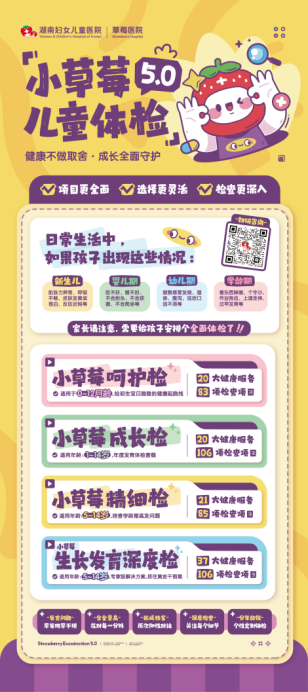 草莓医院小草莓健康计划开启5.0时代,为0-14岁的儿童量身定制分阶段体检套餐,满足不同年龄段的生长发育需求!(编辑:曹晗)