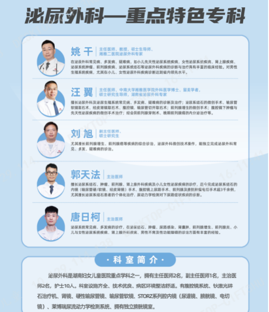 泌尿外科是湖南妇女儿童医院的重点学科。科室由湘雅知名泌尿外科专家姚干教授、董志韬教授、汪翼主任带领,团队医生技术精湛,并配备了国内外先进的医疗设备。