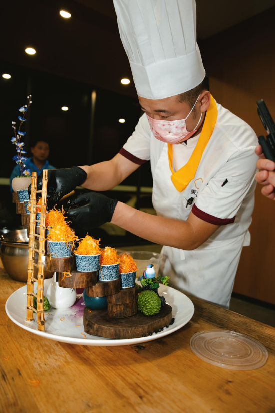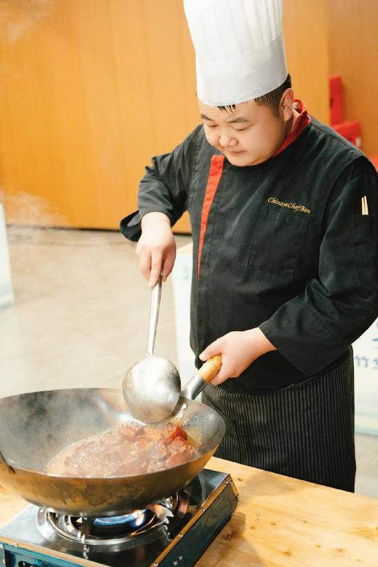 灶火升腾、香气四溢的烹饪区内,大厨们各显其能。来自喜龙美人谷大酒店的大厨肖德贵带来菜品“桃花江传说”,竹笋与罗氏虾在热油中相遇,酥脆与鲜嫩在舌尖共舞,演绎出“靠山吃山,靠水吃水”的智慧哲学。