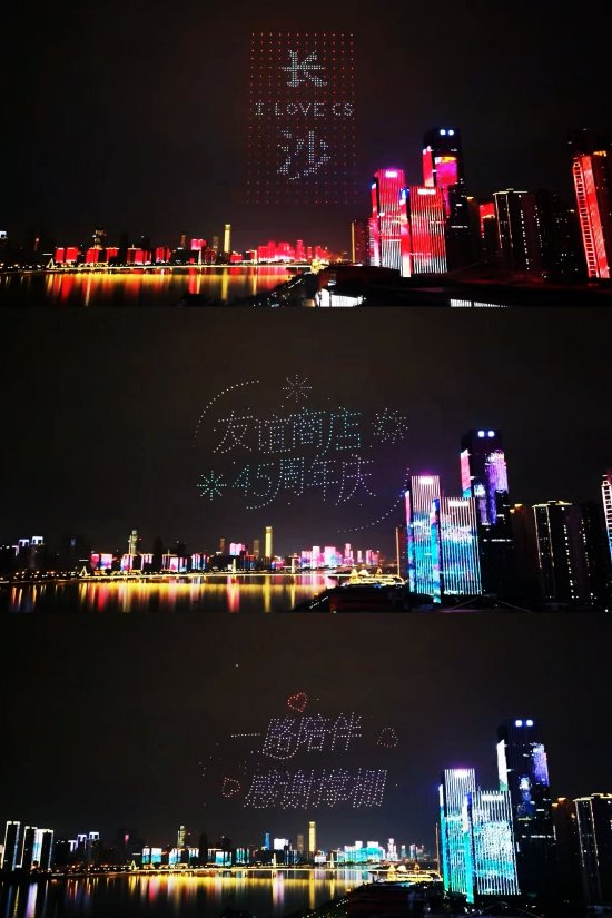 尤为引人注目的是,1月24日晚在湘江畔上演的45周年庆无人机天幕秀。近千架无人机腾空而起,以夜幕为画卷,以科技为笔墨,勾勒出“一路陪伴,感谢撑棚”“我爱长沙”“友谊商店45岁生日快乐”等璀璨图文。这场光影盛典,不仅以现代艺术语言表达了对这座城市的深情,也成为本次周年庆中备受市民热捧的亮点,生动诠释了友谊商店与长沙的双向奔赴。