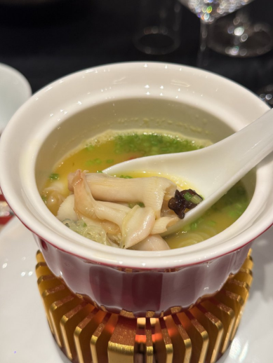 亚东木耳,生长于西藏海拔3000米以上的林地,每朵必须趁晨露未散时手工采摘,干燥后泡发仍保留着雪山森林的脆韧与清气。汤是湘西酸汤的底子,但收敛了那股攻城略地的猛劲,加了些树番茄的柔和果酸。北海蚌仔在金黄的汤中仅烫至刚蜷,嫩若凝脂。木耳的脆、蚌仔的甜、酸汤的醒,在口中形成一种递进的和鸣。这道汤品深得湘菜“鲜辣”的精髓——是一种打开味蕾、唤醒感官的智慧。