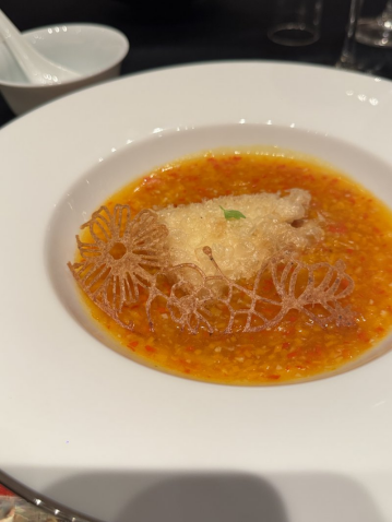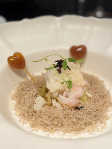 余宗义,长沙君悦酒店的中餐行政总厨,是年轻一代里的“实力派”。一个江苏人,去年却以“江湖食人余”的名号,在某个厨师大赛里拿了探花。不标榜在地化,却将湘菜技法化为本能。前菜 湘西枞菌芋香捞青龙,造型让人莞尔,分明是粤菜“捞起”鱼生的架势,可一筷子下去,全是湘西的山水味。青龙虾刺身薄透,底下垫的是自泡的酸萝卜丝,脆生生,酸冽冽,带着乳酸菌活泼的生命感。酱汁用湘西深山里的枞菌熬制,有松林间的野气。最妙是周边那一圈炸得蓬松的芋头丝,像给这道精致的“混血”菜围了个暖融融的、接地气的筐。一筷捞起,口感与味觉层次噼啪绽放,是仪式感,更是趣味性。