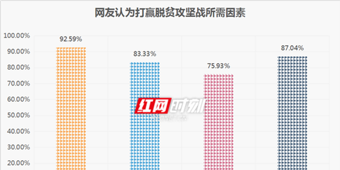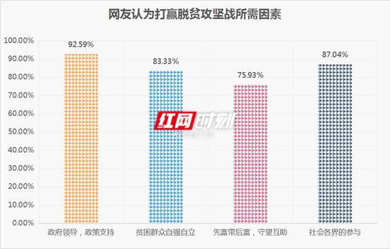 调查显示,网友认为打赢脱贫攻坚这场硬仗,关键在于政府领导,政策支持(92.59%)、社会各界的参与(87.04%)、贫困群众自强自立(83.33%)和先富带后富,守望互助(75.93%)。
