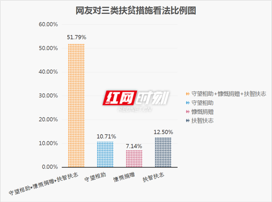 数据显示,超半数网友认为以上三类措施都能帮助到贫困群众,认为扶智扶志类措施更对贫困群众有帮助的占12.5%,认为守望相助更有帮助的占10.71%,而认为慷慨捐赠更有用的占7.14%。