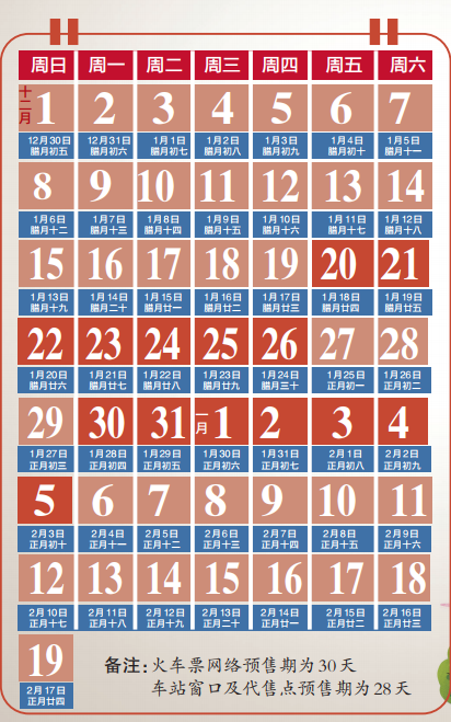 铁路春运为期40天,一般为春节前15天,春节后25天。2020年大年初一是1月25日,由此,2020年春运为1月10日至2月18日。2020年放假安排显示,春节放假7天,为1月24日至30日。这样一来,1月23日、24日为回家高峰日,1月29日、30日为返程高峰日。目前,火车票网络预售期为30天,代售点和车站预售期为28天。
