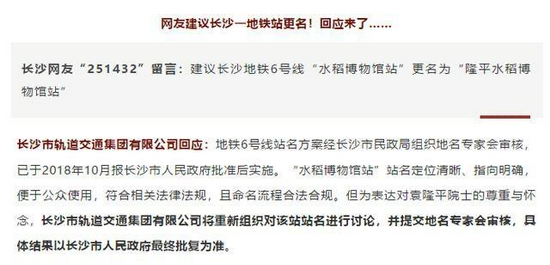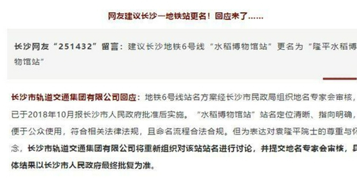 今年6月3日,长沙市轨道交通集团有限公司对此作出回应称,此前,地铁6号线站名方案经长沙市民政局组织地名专家会审核,已于2018年10月报长沙市人民政府批准后实施。“水稻博物馆站”站名定位清晰、指向明确,便于公众使用,符合相关法律法规,且命名流程合法合规。