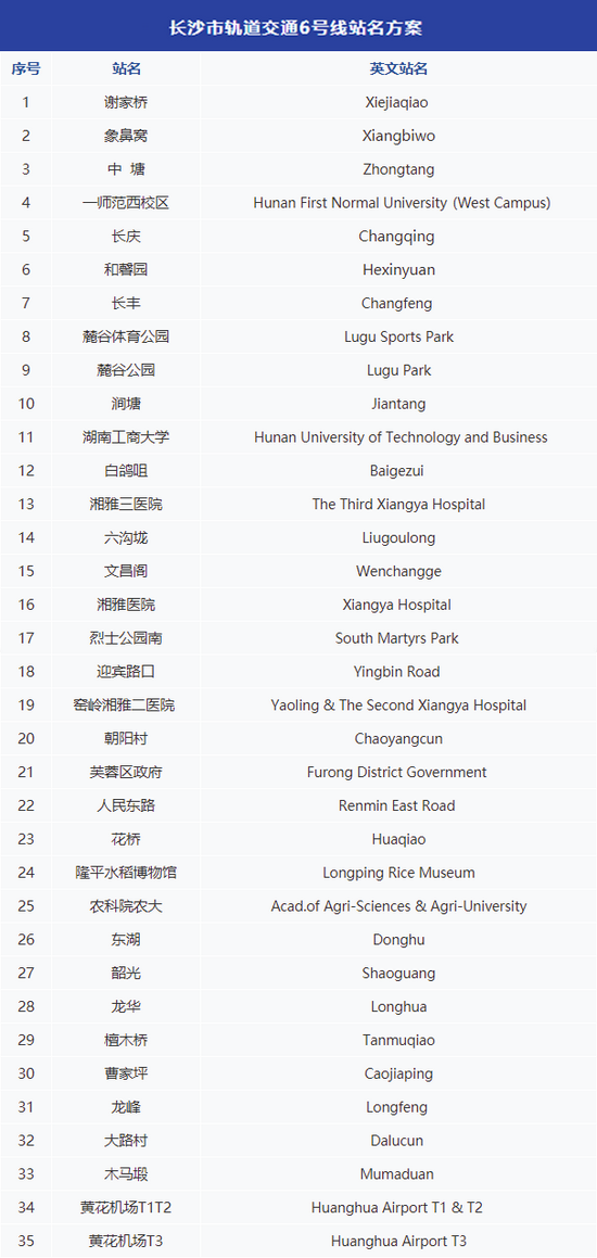 调整后的长沙市轨道交通6号线全线35个车站站名如下: