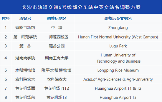 关注红网时刻11月1日讯(记者 张立)据长沙地铁微信公众号消息,依照国务院《地名管理条例》以及湖南省、长沙市相关法律法规要求,为加强轨道交通站点指位功能,丰富轨道交通文化内涵,经地名专家会议论证,长沙市民政局及市委外事办审核,并报市人民政府批准,决定对长沙市轨道交通6号线“省图书新馆”“水稻博物馆”等8个车站中英文站名进行调整。