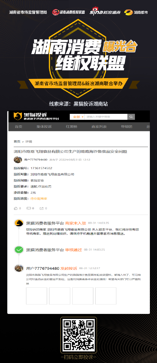 湖南消费维权联盟丨网友投诉“浏阳路路飞翔海沙鱼”吃出编织袋带子