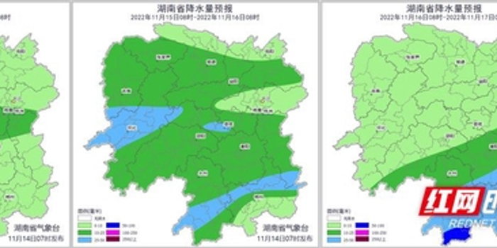 11月15日8时至11月16日8时,阴天有小到中雨,其中湘西州南部、怀化中部、娄底、永州南部、郴州北部、株洲南部局地大雨;北风2~3级;最高气温湘南16~18℃,其他地区14~16℃;最低气温湘南14~16℃,其他地区11~13℃。