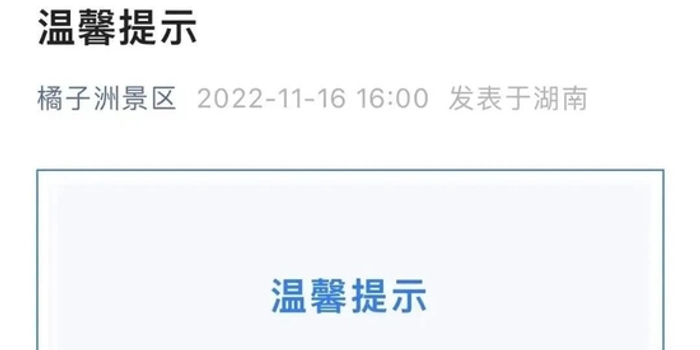 关注11月16日,橘子洲景区官方微信公众号发布消息,根据上级防疫部门最新要求,进入橘子洲景区需出示72小时内核酸检测阴性证明,请您主动配合景区工作人员扫码、测温,并做好个人防护。