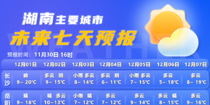 12月1日白天,晴天到多云,湘西南局地有雾;北风2~3级;最低气温湘南10~13℃,其他地区6~9℃;最高气温19~24℃。