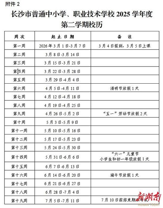 长沙:今年寒假从2026年2月1日开始,2026年3月3日结束,2026年3月5日上课。