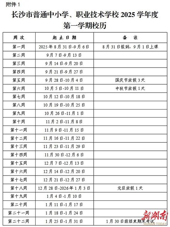 第一学期 :2025年9月1日上课,2026年1月31日结束,全学期共22周。寒假从2026年2月1日开始,3月3日结束。