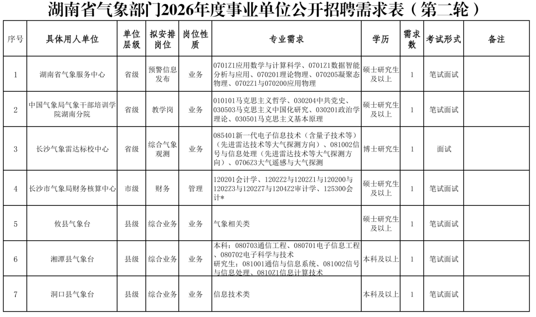 湖南省气象部门2026年度事业单位公开招聘应届毕业生公告(第二轮)(第2604号)