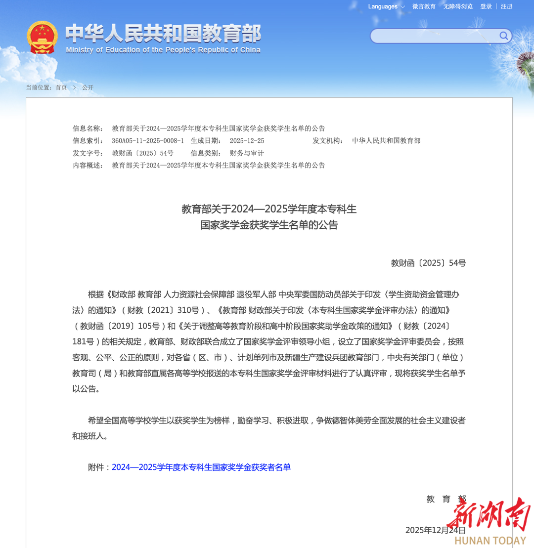 关注国家级荣誉揭晓!近日,教育部官网公布2024—2025学年度本专科生国家奖学金获奖学生名单,湖南共有5431名学子上榜。其中,中南大学获奖人数879名、湖南大学获奖人数555名、湖南科技大学获奖人数96名,排名全省前三。此次湖南上榜人数较去年增加105名,覆盖全省各类高校及多个学科专业,充分彰显了国家奖学金政策的公平性与普惠性。