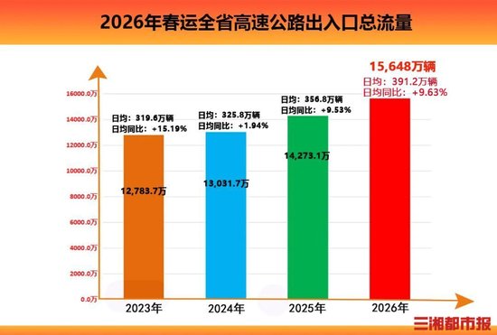 关注3月15日,记者从湖南省高速公路路网运行监测指挥中心获悉,2026年春运40天(2月2日至3月13日),全省高速公路出入口总流量达15648万辆,日均流量391.2万辆,同比增长9.63%,约为平日流量的1.62倍。
