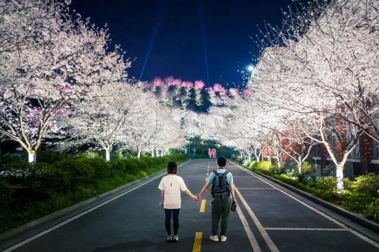 绝美夜樱,光影梦幻:白天是纯白浪漫,夜晚则是赛博梦幻,灯光下的夜樱是情侣约会的绝佳场景;