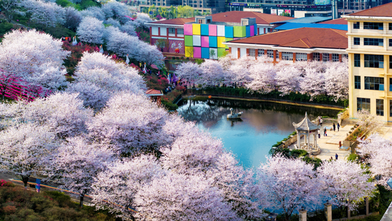 这里不仅是湖南省首批工业旅游示范园区,更是一个把工业硬朗与自然柔美结合得恰到好处的宝藏地。每年三月,30余个品种的樱花次第开放,粉白相间的花海如云似雪,铺满整个山坡。